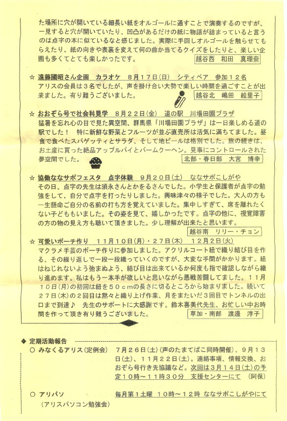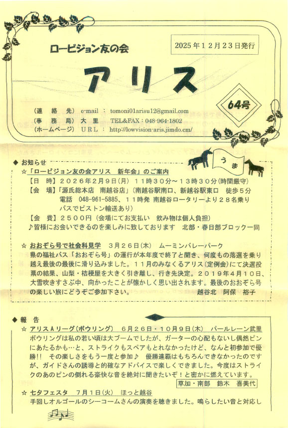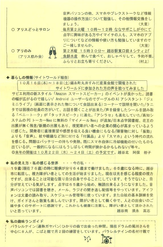 | 「アリパソの会」のご報告 毎月、第一土曜日の朝10時から「ロービジョン友の会 アリス」の「アリパソの会」(パソコン相談会、越谷駅前 の支援センターななサポこしがや)。毎回、数名の方が参加 してきている。1月は7日に開き、2つの課題を解説。 1つは、ショートカットキーを使って、シャットダウンする 方法は⇔「Altキー」と「F4キー」を同時に押すと、「シャ ットダウン」の窓が出るので、エンターを押す(これはその 場で検索した。音声パソコンはショートカットキーですすめ ていくので)。 2つ目は、「朝日自動車」(越谷市内)のバス停の出し方。 「NetReader Neo」を使って、Googleの検索ページに到 着。 しかし、そのページに入ってからが大変。タブで一項目ずつ 調べるが、バスの項目に入って(袋状態⇔バス時刻表・時刻 表→バス停の検索)からが大変、晴眼者ではないとやや無理 なので、順番を録音してもらい、自分で試してみるよう相談。 やってみたい方は、直接、おいでください。 まだ何か月目ですが、事務局の女性から「コープみらいのイ ンターネット注文票がTOP画面に出てこない」という相談 も、その場で解決した。(飯島信吾) |