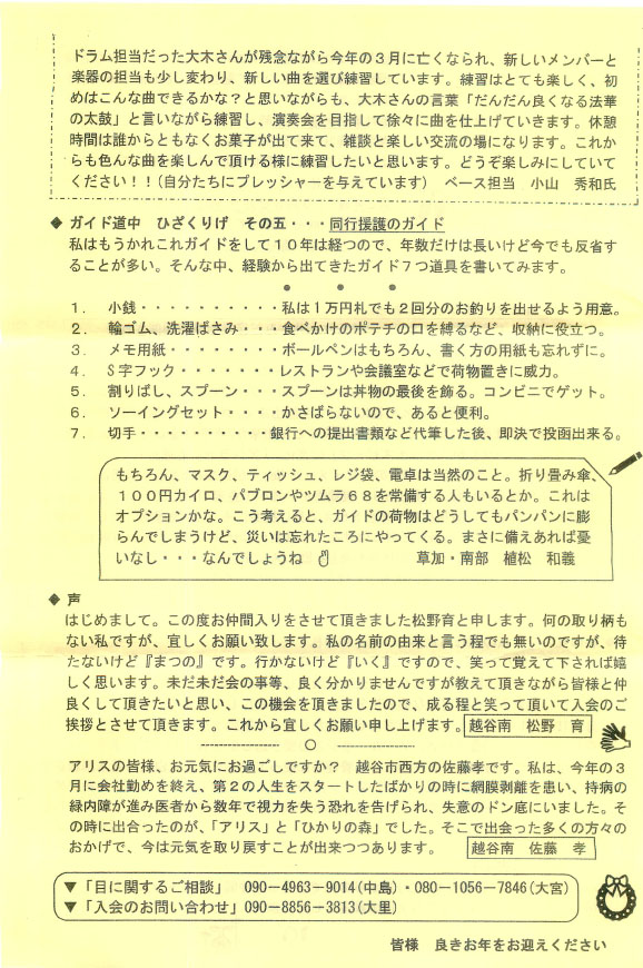 | 来年、1月12日の「のんべい会(新年会)」で一区切りに しようと思います。 題名 :アリスの広場[Arisunoh:94] のんべい会について (アリ飲み会) 宮田 新一<shin-jww@khaki.plala.or.jp> 12月10日発信 こんばんは 宮田です のんべい会 来年1月で20年近い歴史を閉じようと思います。 コロナ過で参加者が減少(亡くなった人も増え)、高齢化と相ま って、寂しい参加者の減少です。 一人・2人に時も 歩行訓練の曜日 宮城先生の時間に合わせて 八剣伝に始まり七味屋? 魚鮮水産と 多い時には15人以上の 参加者、アリスの運営についての議論、行事の計画など喧々諤々 ワイワイガヤガヤ 情報交換 コロナ過でも やろうよ やろうよ と言う人も、でも今はそ の人も不参加に。 そんな状態に こんな状態だから ここらで一区切りかな? 来年1月12日ののんべい会(新年会)で一区切りにしようと思い ます。 たくさんの方の参加を期待します。 今後は、村上さんの主導でやって頂けたらと思います。 2023年1月12日 ののんべい会 (新年会) たくさんの方 の参加を期待します。 最後かな? と思いますので! 宮田新一 |