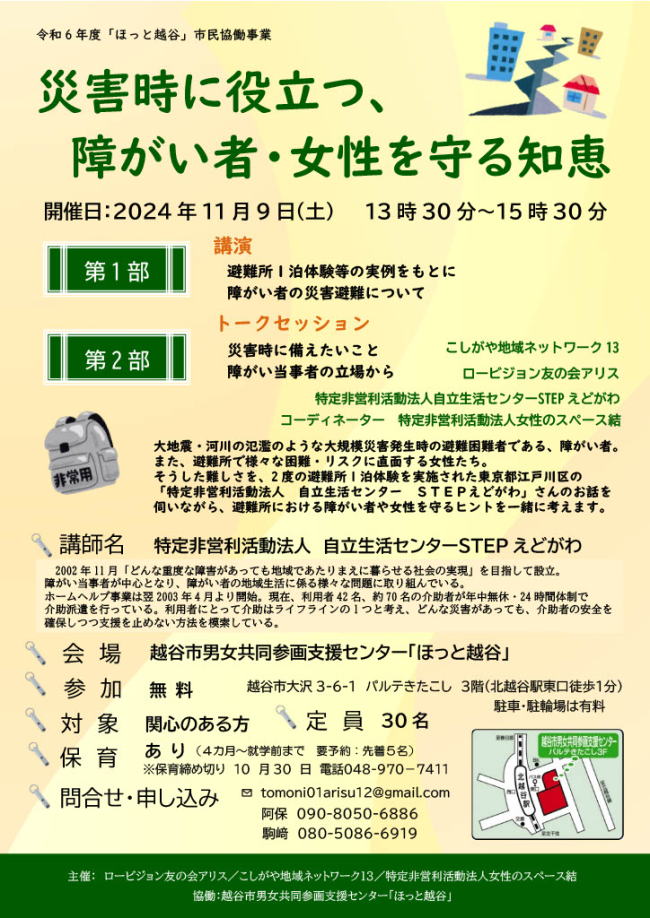 | あぼです・・・。 昨年に引き続き ケネットさん 結さんとの共同事業が プレゼンを経て、決定の連絡がありました 11月9日(土) 13時30分~15時30分 越谷市男女共同参画支援センター「ほっと越谷」にて 「災害時に役立つ、障がい者・女性を守る知恵」 〈第1部〉 ステップえどがわさんの避難所体験等のお話 〈第2部〉 ・災害時に役立つ備品の紹介 ・障がい者当事者の立場から ・女性の立場から ステップえどがわさんは 江戸川区の重度の身体障害者の通所施設で 2度 避難所1拍体験をされ NHKの取材も 入った団体です 取り急ぎ、決定通知のご連絡迄。 宜しくお願い致します。 ![]() |