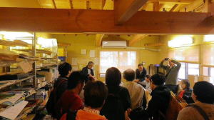| 品ぞろえ豊富なあしたやの前で長尾さんのお話を聞く | 共に働く思いを熱く語る長尾さん |
