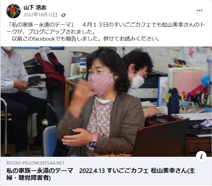 聴覚障害ゆえの虐待の連鎖を断ち、子や孫を地域にはばたかせ自らも地域に友人・知人のつながりを拡げ、親の介護もしてきた松山さんは一人旅も好き。松山さん流の旅の楽しみ方をゆるやかに語る。(手話通訳依頼中)