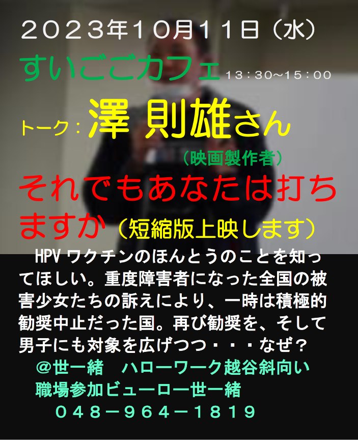 第1、2,3,5水曜の会場は、ハローワーク越谷向かいの職場参加ビューロー世一緒です(要予約048-964-1819)。 どの日も13:30~15:00 ゲストトークがあります。街で生きる障害のある人ない人、いろんな人が語ります。 第4水の会場は、せんげん台イオン並びの就労移行・B型多機能「世一緒」です。(せんげん台048-971-8038) おまちがえないようにおでかけを。