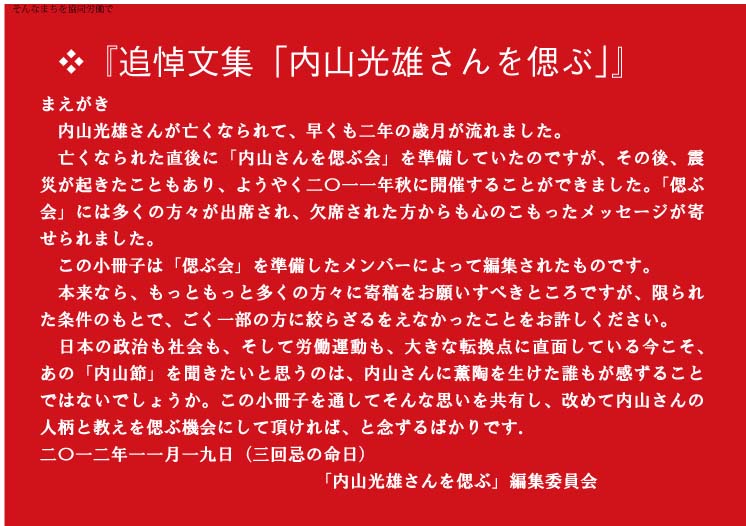 『追悼文集 内山光雄さんを偲ぶ』 『追悼文集 内山光雄さんを偲ぶ』(2012年11月19日、「内山光雄さんを偲ぶ」編集委員会、総評退職者会気付、03-3251-0311) ![]() 目次 内山さんのことども 兵藤 釗 生涯の教師としての内山光雄さん 高木郁朗 大地を踏みしめた天与のオルグナイザー 山本 博 『職場の労働運動』のこと 小松義雄 地域闘争に遺した偉大な足跡 粟森 喬 職場活動こそ人間がいる 渕上貞雄 内山光雄さんのご逝去を悼んで 越田智宏 追悼の辞 渡邊國衛 道南バス会社更正法下の闘いと組合員読本づくり 大谷浩 職場総点検運動 井田隆重 面白うて やがて身に泌む 内山節 高橋征夫 内山光雄さん追悼 高橋 均 自主管理社会の原典を学ぶ 佐々木啓之 観光労連育ての親、そして上司として 北岡孝義 “職場”と“人間”に徹した指導者 瀧井葉二 感謝の言葉 在り日を偲んで 内山一枝 |