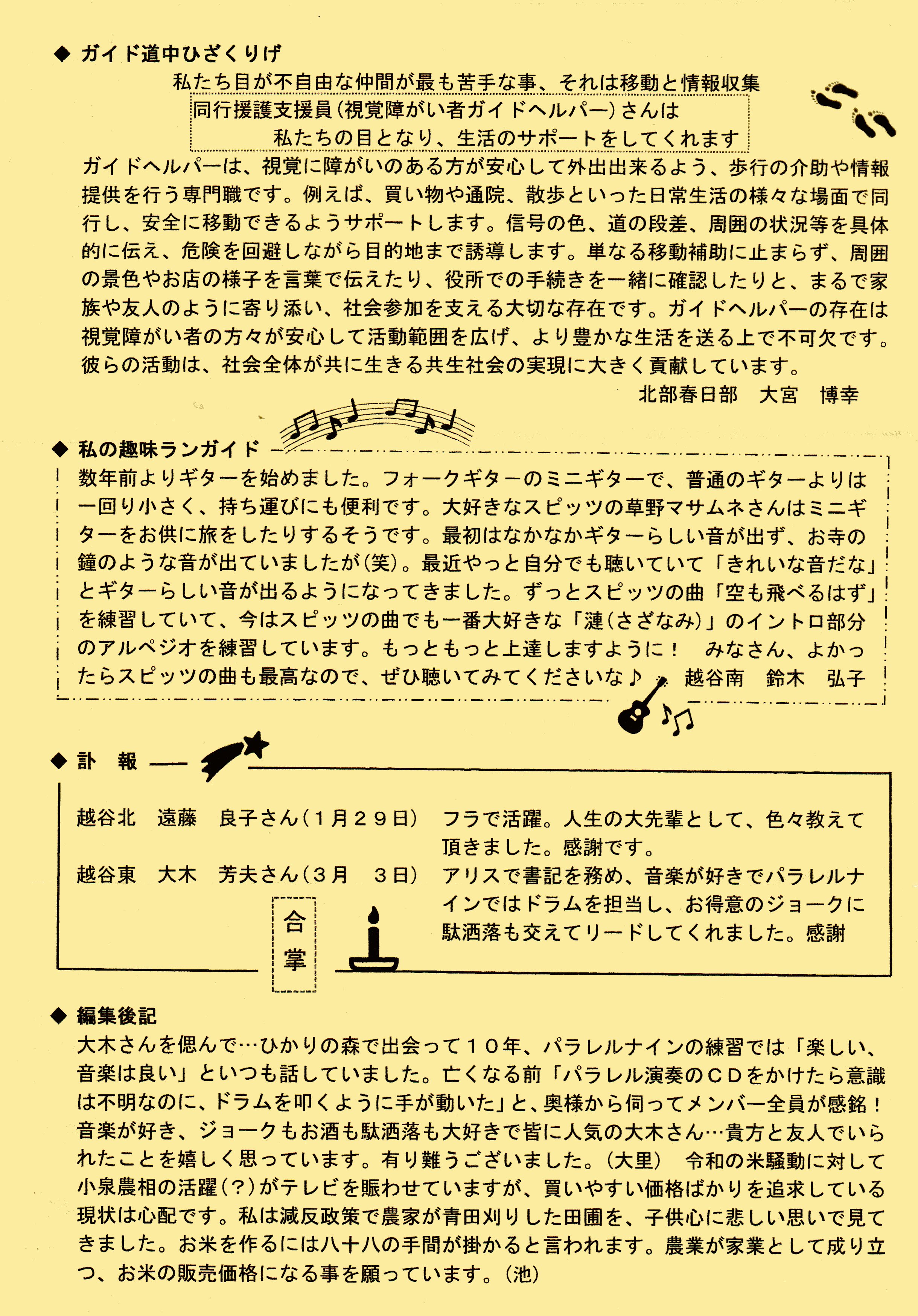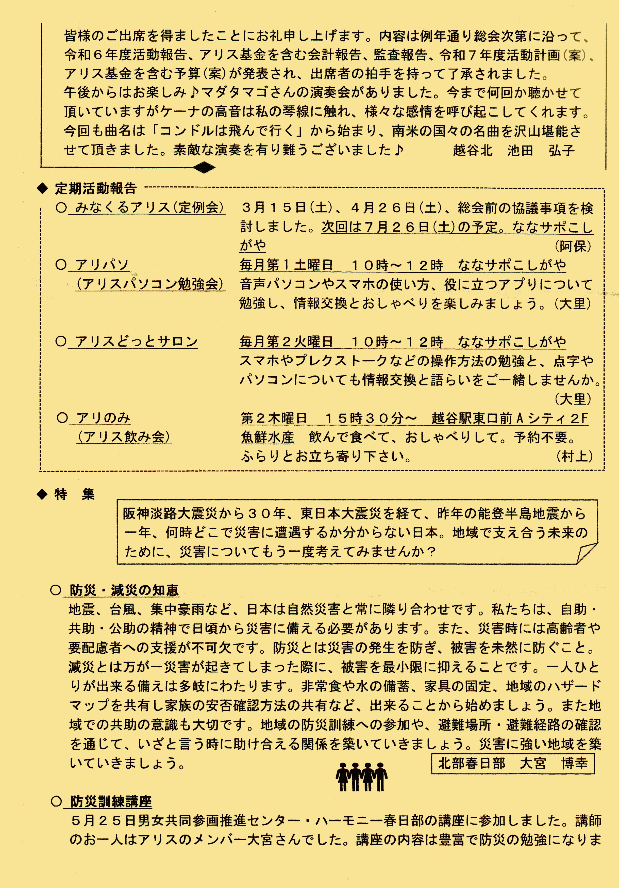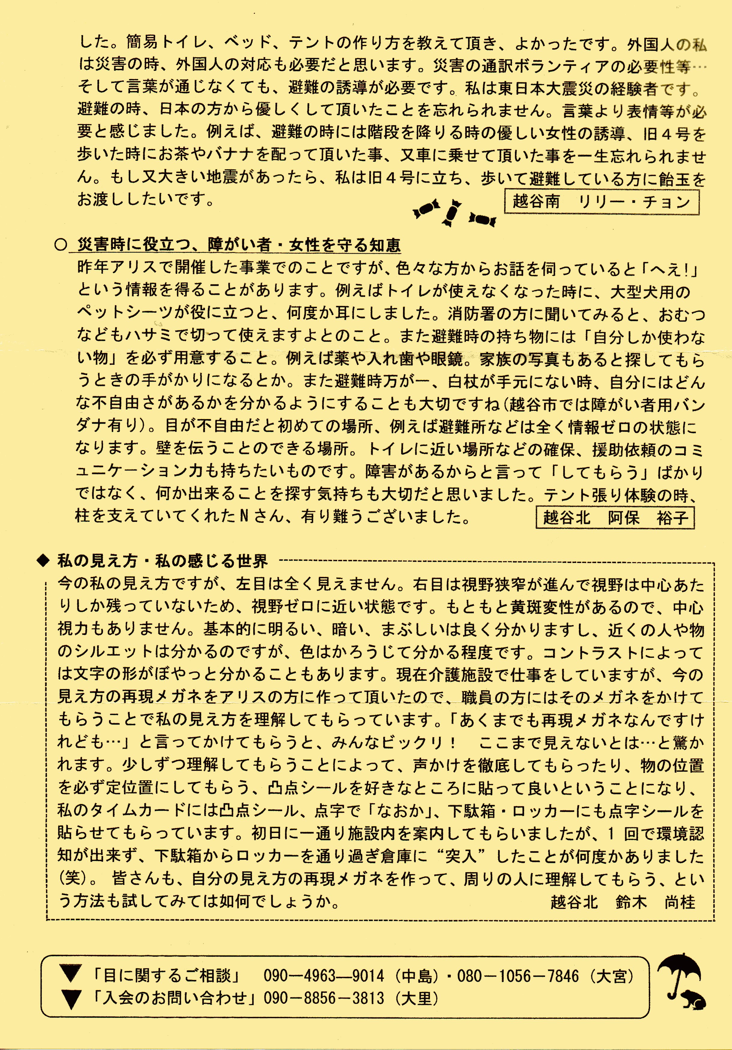 「アリパソの会」のご報告 毎月、第一土曜日の朝10時から「ロービジョン友の会 アリス」の「アリパソの会」(パソコン相談会、越谷駅前 の支援センターななサポこしがや)。毎回、数名の方が参加 してきている。1月は7日に開き、2つの課題を解説。 1つは、ショートカットキーを使って、シャットダウンする 方法は⇔「Altキー」と「F4キー」を同時に押すと、「シャ ットダウン」の窓が出るので、エンターを押す(これはその 場で検索した。音声パソコンはショートカットキーですすめ ていくので)。 2つ目は、「朝日自動車」(越谷市内)のバス停の出し方。 「NetReader Neo」を使って、Googleの検索ページに到 着。 しかし、そのページに入ってからが大変。タブで一項目ずつ 調べるが、バスの項目に入って(袋状態⇔バス時刻表・時刻 表→バス停の検索)からが大変、晴眼者ではないとやや無理 なので、順番を録音してもらい、自分で試してみるよう相談。 やってみたい方は、直接、おいでください。 まだ何か月目ですが、事務局の女性から「コープみらいのイ ンターネット注文票がTOP画面に出てこない」という相談 も、その場で解決した。(飯島信吾) |