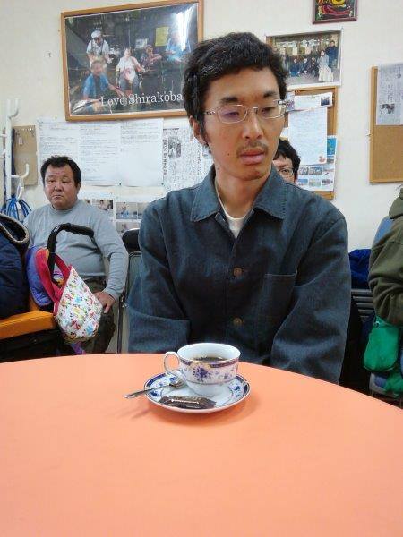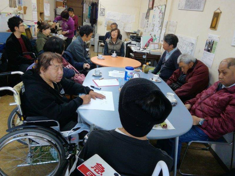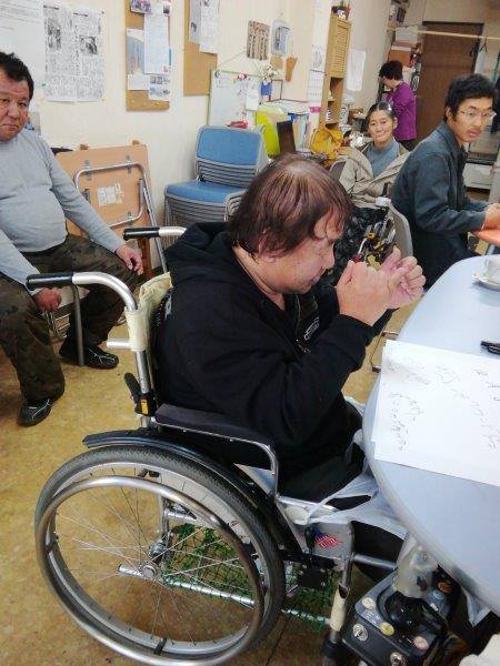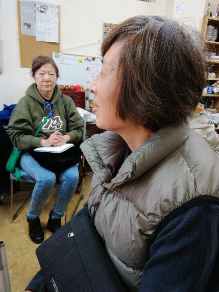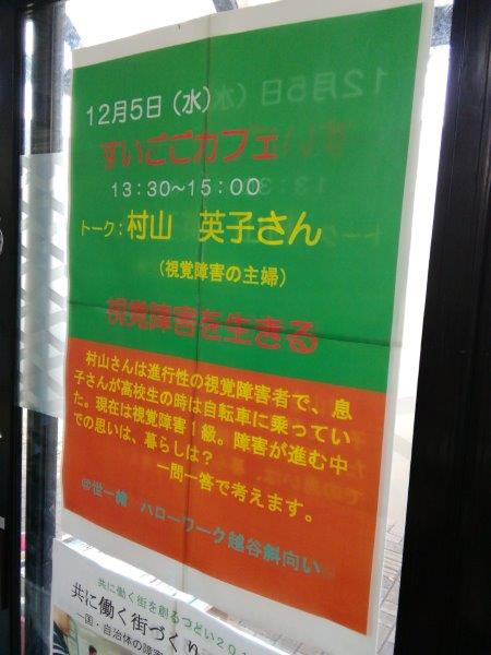12月5日のすいごごカフェのゲストは視覚障害の主婦・村山英子さん。いつもすいごごカフェの途中でミニ手話タイムの講師を務める盲ろう下半身まひの橋本克己画伯の風呂や食事の介助に入ったり、くらしセンターべしみの非常勤職員としても働く須賀保昭さんが、村山さんの同居の息子さんとして今日は母のかたわらに。