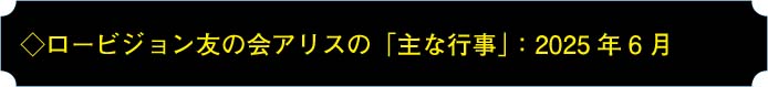 *ロービジョン友の会アリス* 第25回 総会次第* 1.開会の言葉 * 2.会長挨拶 * 3.議長選出 * 4.議 題* ① 2024(令和6)年度活動報告 * ② 2024(令和6)年度会計報告(アリス基金を含む) * ③ 2024(令和6)年度監査報告 * ④ 2025(令和7)年度活動計画(案)について * ⑤ 2025(令和7)年度予算(アリス基金を含む)(案)について* ⑥ 新役員(案)について 5.閉会の言葉 * 6. お知らせ* ☆ * 閉 会* *~ 昼 食 ~* *☆13:00~14:00 :フォルクローレ演奏 「mada TAMAGO」 日 時 2025(令和7)年 5月 10日(土)、10:00~14:00 * 会 場 ほっと越谷* 2024(令和6)年度活動報告* 1.第24回総会 5月10日(土) ほっと越谷にて 40名* 2.「みなくるアリス」(定例会)、(開催月の第4土曜日を原則とする) ななサポこしがやにて 。7月20日、2025(令和7)年3月15日 2回 22名参加(4月27日はアメディアフェア、6月29日は七夕フェスタ、9月21日は協働フェスタにそれぞれ変更)。※ななサポこしがやは10月21日~1月31日まで改装のため利用不可* 3.専門部 * ① 会報 年2回 (6月:61号・12月:62号発行)*他は、事務局通信で連絡* ② 地域交流 * ・第23回七夕フェスタ 6月29日(土)ほっと越谷にて 、町田宏さんとまきりんさんの演奏 37名参加* ・福祉体験学習 6月15日(土) がもう寺子屋 * ・イオンイエローレシートキャンペーン参加(毎月11日)、5月寄付金・25,700円)* ・第17回協働フェスタ 2024(令和6)年9月21日(土)、中央市民会館にて * ・「災害時に役立つ、障がい者・女性を守る知恵」、11月9日(土)ほっと越谷にて 55名参加*ケネット13、女性のスペース結との協働企画* ③ 社会活動 * ・誰もがくらしやすいまちづくり実行委員会 2回* ・福祉審議会 4回* ・障害福祉課によるヒアリング 11月20日(水) 5名参加* ④ レクリエ-ション * ・おおぞら号バスツアー* 5月15日(水) 那須南が丘牧場 38名参加* 12月18日(水) 豊洲市場 26名参加* ・サークル活動 身体ほぐし こばと館にて 12回 109名参加* ・アリのみ 毎月第2木曜 魚鮮水産にて 12回* ・アリスAリーグ(ボウリング) ニューパールレーン武里にて* 4月11日(木) 5名参加* ・ありさんぽ 11月27日(水) 国立西洋美術館 6名参加* ・アリスカラオケ カラオケバンバンにて*7月21日**(日)4名参加、11月26日(火)6名参加 * ⑤ 訓練・情報ネット* ・アリスパソコン教室(勉強会) ななサポこしがやにて*毎月第1土曜日開催 11回 93名参加 * ・アリスどっとサロン(点字・スマホ勉強会) ななサポこしがやにて* 毎月第2火曜日開催 10回 57名参加* 4.新年会(担当 越谷北ブロック) *2025(令和7)年1月28日(火) 源氏総本店 25名参加* *2025(令和7)年度活動計画* 1.運営部* 第25回総会 5月10日(土) ほっと越谷にて * 2.みなくるアリス(定例会)(開催月の第4土曜日を原則とする)*4月26日、7月26日、9月27日、11月22日、*2026(令和8)年3月28日 その他必要な場合随時開催 ななサポこしがやにて* 3.専門部* ① 会報 会報発行 年2回 *(6月:63号発行・12月:64号発行)*他は、事務局通信での連絡とする* ② 地域交流*ほっと越谷第24回七夕フェスタ 7月1日(火)*協働ななサポフェスタ2025 9月20日(土)・21日(日)*ほっと越谷 市民協働事業(未定)・講演会等* 福祉体験学習、他* ③ 社会活動*誰もがくらしやすいまちづくり実行委員会*バリアフリー点検 越谷市社会福祉審議会*施設見学、他* ④ レクリエーション* おおぞら号で行く社会見学 随時* サークル活動 身体ほぐし こばと館にて 毎月第2水曜日開催* アリのみ 魚鮮水産にて 毎月第2木曜日開催* アリスAリーグ(ボウリング) 随時* アリスカラオケ 随時* ありさんぽ 随時* その他、料理教室、ランチ会、アリスSTT、DVD上映会など 随時* ⑤ 情報・訓練ネット* アリスパソコン教室(勉強会) ななサポこしがやにて*毎月第1土曜日開催* アリスどっとサロン(点字・スマホ勉強会) ななサポこしがやにて *毎月第2火曜日開催** ※新製品や関心のある製品の紹介やお試しも随時行う * 4.新年会 (担当:北部・春日部ブロック) (2026(令和8)年1月)* 5.その他* ・会員の個人情報は、会の活動目的以外には使用しません* ▽2025(R7)年度ロービジョン友の会 役員・委員名簿 〇運営部 会長 あぼ裕子 副会長 3名、村上かをる リリーチョン 鈴木弘子 書記 鈴木力也 会計 石川秀子 事務局 大里正二 〇専門部 会報 3名、池田弘子 村山英子 村上かをる 地域交流 4名、リリーチョン 大里正二 鈴木弘子 須永高志 社会活動 2名、あぼ裕子 鈴木弘子 レクリエーション 6名、大里正二 リリーチョン 笹岡ともこ 鈴木なおか 鈴木弘子 鈴木力也 訓練・情報ネット 5名、村上かをる 大里正二 須永高志 鈴木喜美代 武藤優夫 ▽ブロック長 5ブロック 越谷東・西 大里正二 越谷南 リリーチョン 越谷北 鈴木なおか 草加南部 渡邊淳子 北部春日部 村上かをる 相談役 松田和子 会計監査 2名、池田弘子 大里正二(越谷東)、(監査2名目は各ブロック持ち回りで担当) 以上 |
