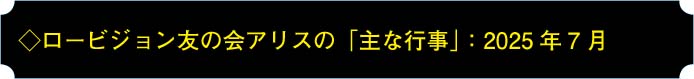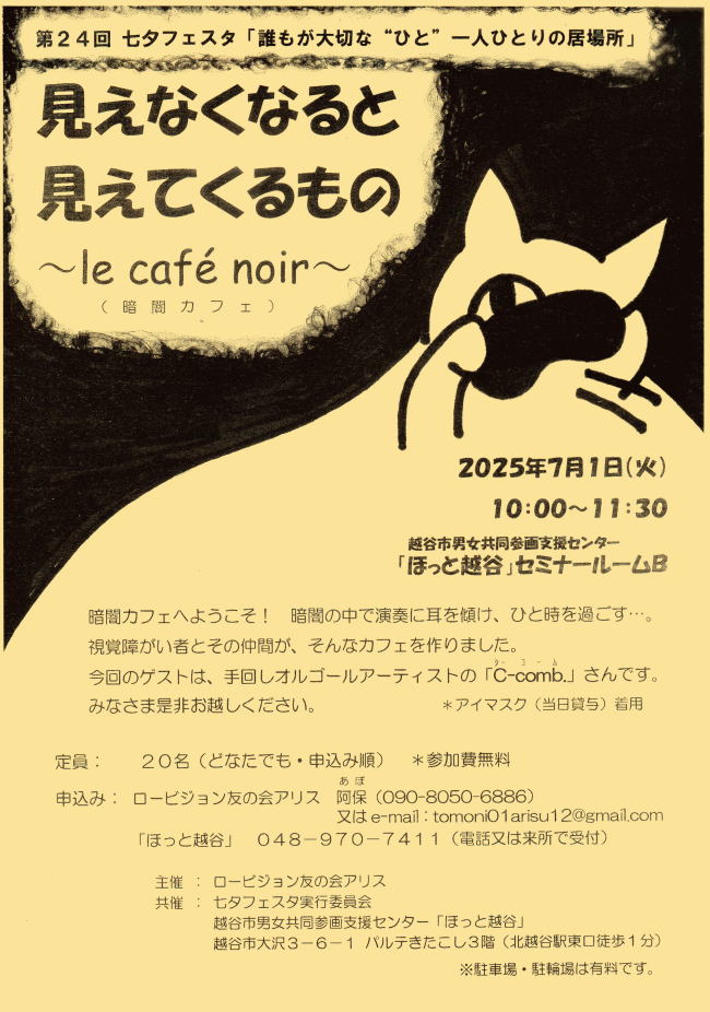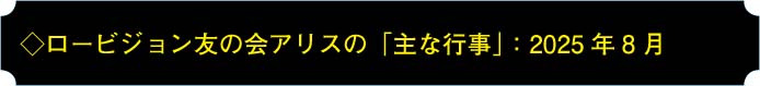 2025.8.01 あぼです。7月31日 先日のみなくるアリスでもお知らせしましたが、協働ななサポフェスタの9月20日(土)10時〜15時 支援センター内ブース、体験場所が確保できました。(当選おめでとうございます、と言われました) 当日は、点字体験などを予定致しております。御協力頂ける方を募集致しますので、皆さまの御協力、宜しくお 願い致します。 当日は、飲食、物販、ステージなどもありますので、お楽しみに。 以前の協働フェスタとななサポまつりを一本化した企画です。 どうぞ宜しくお願い致します。 あぼです。7月29日 メール環境にある女性の方にのみご連絡致します。 8月のリリーさんのはればれこしがやは、 4日 月曜 と 29日 金曜 です。 取り急ぎお知らせまで。 宜しくお願い致します。 あぼです。7月28日 メール環境にある方にのみご連絡致します。 26日 みなくるアリス議事録にありました、イベント情報です。 2件あります。 1、目の愛護デー 対象はどなたでも参加可能日時は令和7年10月5日 日曜日 13時から16時 場所はさいたまスーパーアリーナTOIRO 費用は無料 申し込みは不要 2、目の予防とリハビリ 江口先生講演会 8月23日 土曜日 午後2時から4時までです 会場は武蔵浦和コミュニティセンターです。 以上、大宮さんからの情報です。 大宮さん有り難う御座いました。 あぼです。7月28日 メール環境にある方にのみご連絡致します。 7月26日 みなくるアリス 議事録です。 1、連絡事項 ・8月22日 おおぞら号について 本日現在33名参加予定(38名定員) ・9月22日(土)協働ななサポまつり 参加申込中。詳細は後日。 ・10月16〜18日、サイトワールド(出店内容、アリスツアーは後日お知らせします) ・9月13日(土)午前 みなくるアリス開催の予定(支援センターフリースペースにて) ・手回しオルゴールのシーコームさん 8月一杯カフェ803にて展示、グッズ販売あり ・8月23日(土) 江口先生講演会(詳細は追ってご連絡します) ・10月5日(日) 目の愛護デー スーパーアリーナにて。詳細は追ってご連絡します。 ・ねずみの森フアンの方は10月5日(日) 草加中央公民館のお祭りに参加します。詳細は渡邊淳子さんにお尋ね 下さい。 2、声のたまてばこ(アリス朗読) ・「戦争のつくりかた」あぼ ・リリーさんの漫談 ・「青い封筒」(松村比呂美) 白石さん 3、アリマ(アリスのフリマ風お宝交換会) 以上です。 あぼです。7月23日 メール環境にある方にのみご連絡致します。 8月5日 火曜 水辺の市 夏まつり 15時〜18時30分 越谷市役所前ウッドデッキにて 15時20分〜 リリーさんの爆笑ヌンチャクのステージがあります。ヌンチャク体験コーナーもあり。 お時間のある方は、是非お越しください。 (雨天の場合は翌日8月6日です) 以上、宜しくお願い致します。 |