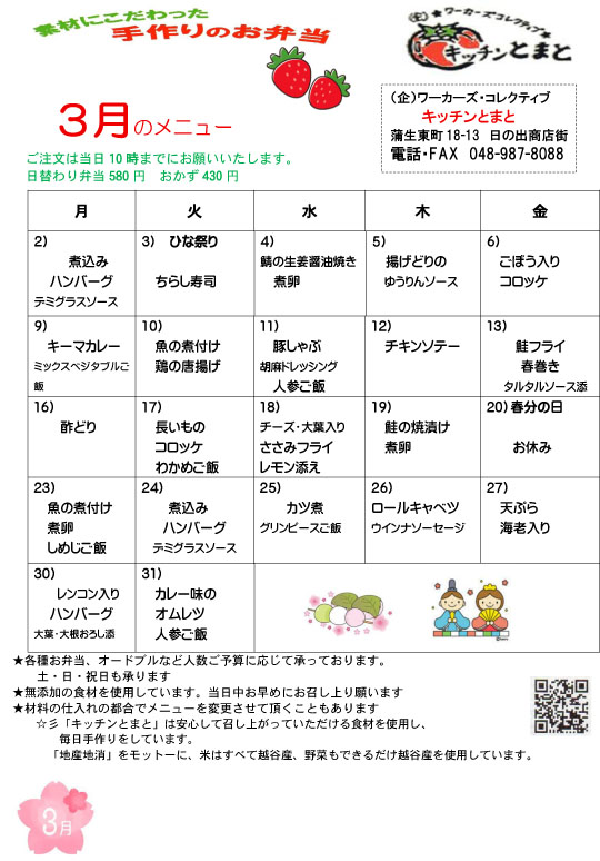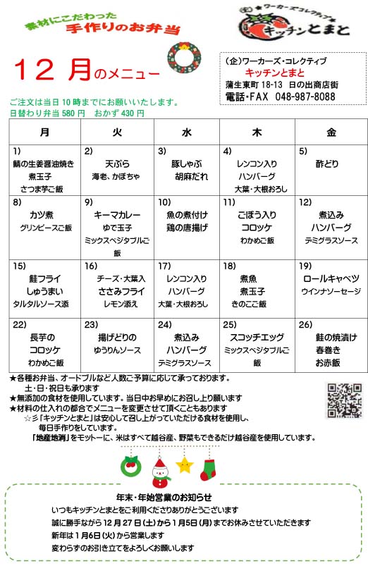 「ワーカーズ・コレクティブ キッチンとまと」は、可能な限り地場産の農作物を使用して、安全・安心なお弁当を届け、誰でもが高齢になっても働く場としていきたいと願っています。
