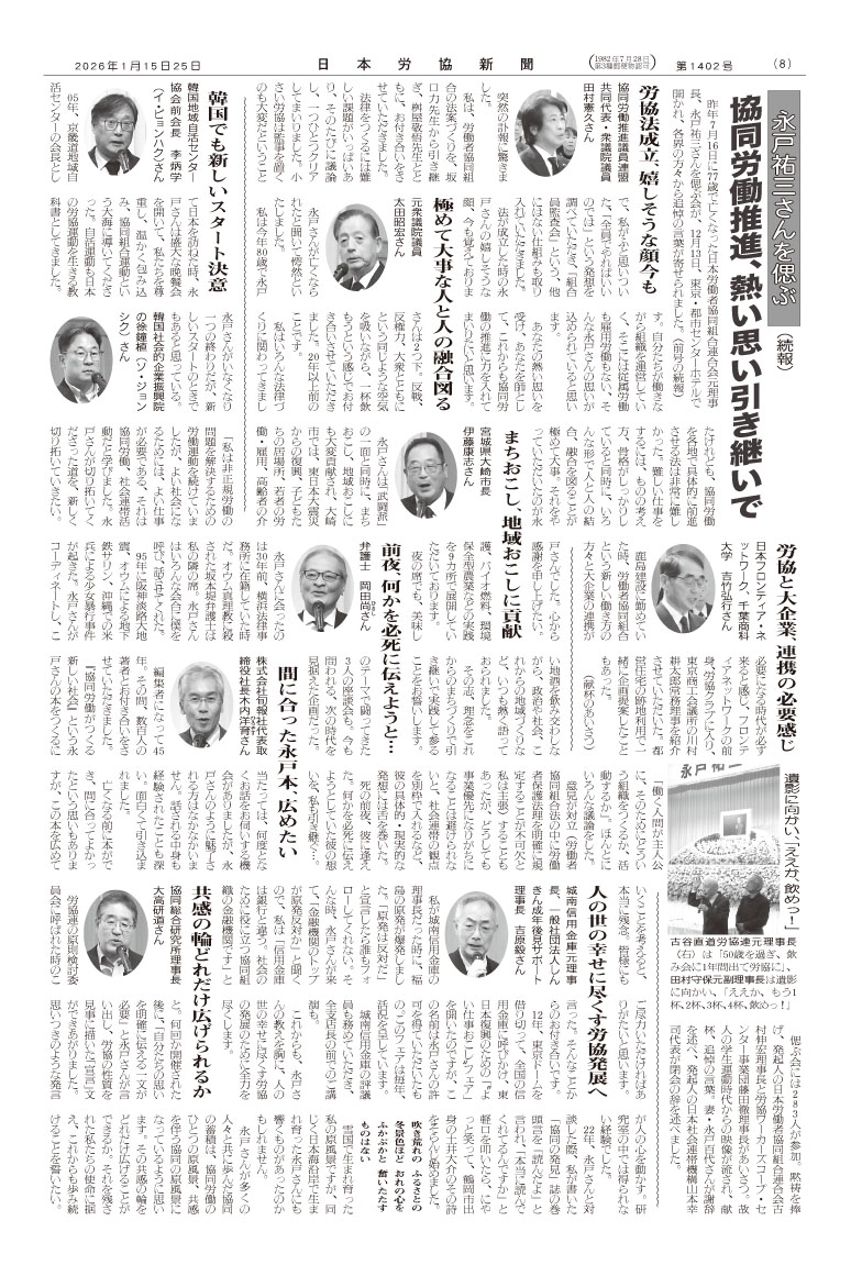 「協同労働推進、熱い思い引き継いで」 ――永戸祐三さんを偲ぶ(続報) 偲ぶ会(2025年12月13日(土))には283人が参加。 (「日本労協新聞」2026年1月15日・25日号掲載)。 ![]() |