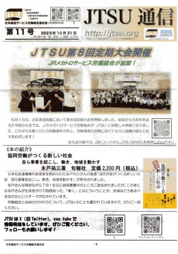 2025.11.19 ❖「JTSU通信」(日本輸送サービス労働組合連合会発行、第11号、2025年10月31日) 《本の紹介》 『協同労働がつくる新しい社会 自ら事業を起こし、働き、地域を動かす』(永戸祐三著、旬報社、、定価2,200円(税込み) 日本社会連帯機構代表理事を務められた永戸祐三さんの著書『協同労働がつ<る新しい社会 自ら事業を起こし、働き、地域を動かす』が発刊されました。 永戸さんは残念ながら7月16日に病気療養中のところご逝去されましたが、この本には永戸さんが生涯をかけて向き合った、「働く」とはどういうことか、地域はどうあるべきなのかというテーマが記されています。 労働組合と地域のかかわりについて、JTSUのことも書かれていますので、ぜひご一読ください。 ![]() ▼「永戸祐三のページ」の検索。 |