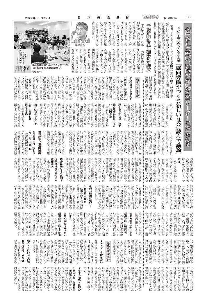▽2025.08.03 ![]() 「協同労働がつくる新しい社会」ー 永戸祐三の格闘ーを読んで 永戸祐三さんは亡くなる前に一冊の書を著しました。『協同労働がつくる新しい社会』(旬報社)です。「永戸祐三の一代略記だが、それ以上に、協同労働の形成史」(西谷氏)、「社会を変えようと血のにじむような努力をしてきた人間の人生史であり、彼が関わった社会史」(汐見氏)、「読む者に希望を与える著書」(岩垂氏)。推薦の言葉から。他にも多くの方々から声を寄せていただいています。 |