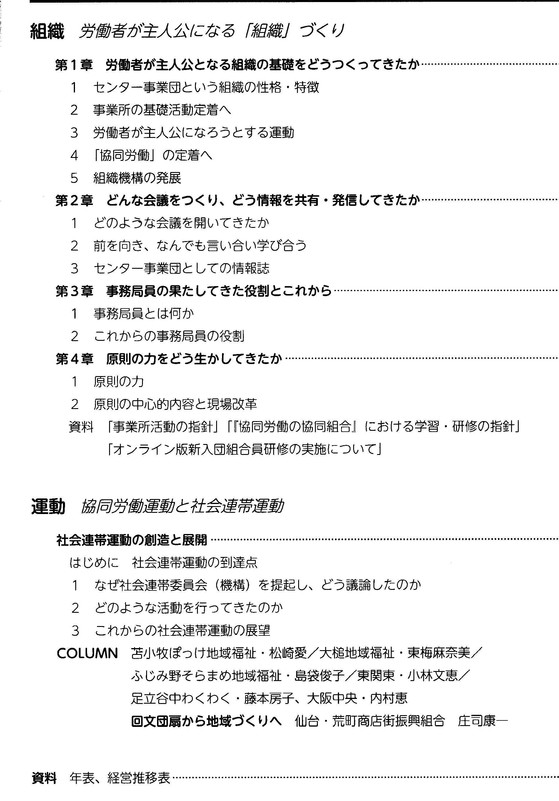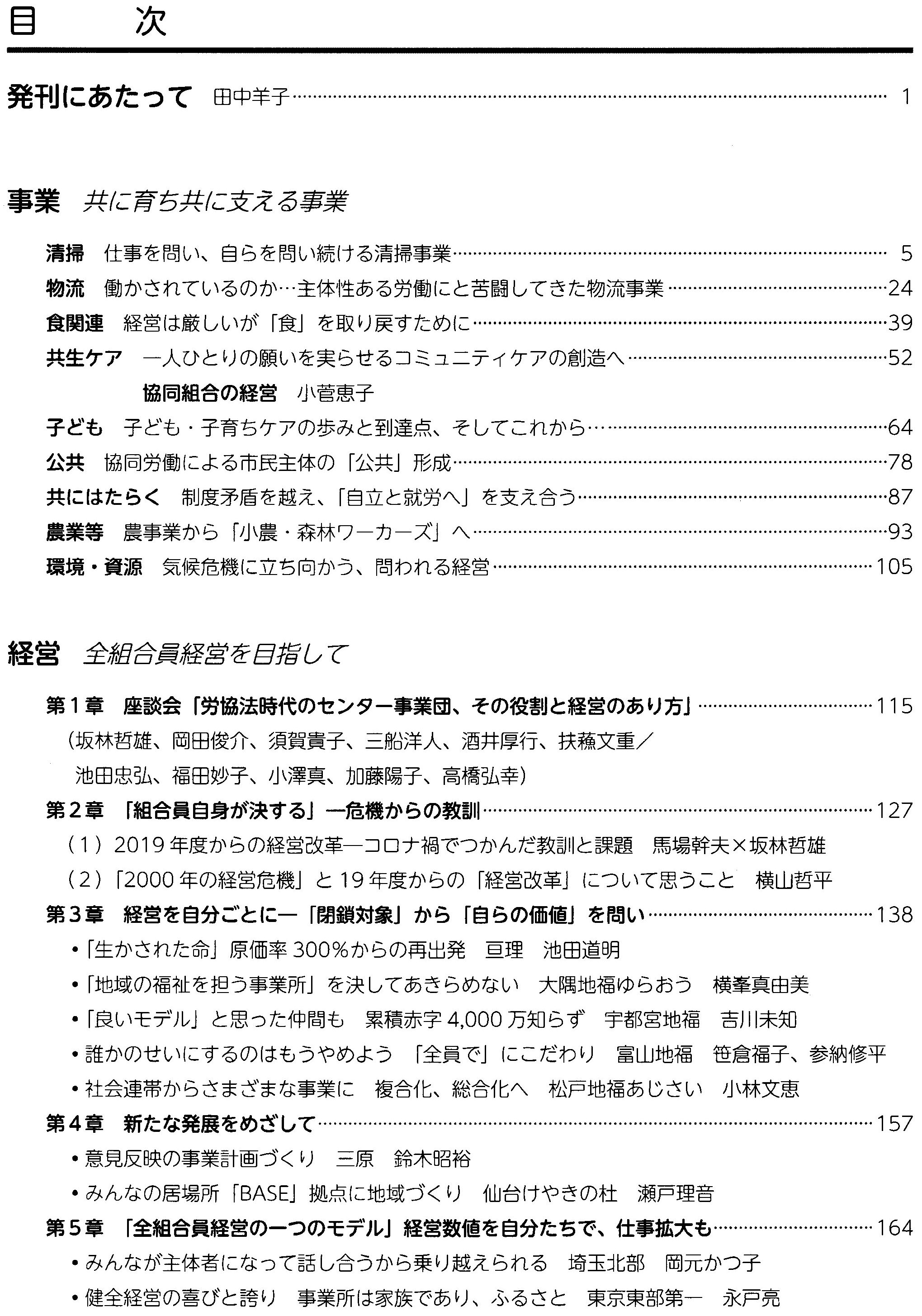 | 『みんなで歩んだよい仕事・協同労働への道、そしてその先へ ワーカーズコープ三五年の軌跡』(日本労働者協同組合(ワーカーズコープ)連合会、2023年6月15日 A4判 286p) 目 次 ◆グラビア版 「写真と労協新聞で綴る ワーカーズコープ三五年の軌跡」 ◆発刊にあたって 日本労働者協同組合(ワーカーズコープ)連合会 理事長 永戸 祐三 ◆発刊によせて――メッセージ 国際協同組合同盟 (ICA)会長 モニク・ルルー 産業労働者・熟練工業者・サービス生産者協同組合国際機構(CICOPA) 事務局長 ブルーノ・ローラン 国際労働機関(ILO)駐日事務所 代表 田口晶子 日本協同組合連絡協議会 (JJC) 委員長 奥野長衛 第一章 ワーカーズコープの体験的歴史と思想 永戸祐三(編集・松沢常夫) ▽ページが乱れていましたので、訂正(2023.09.08) ◆第一節 事業団時代 ◆第二節 労働者協同組合時代 ◆第三節 協同労働の協同組合時代 ◆第二章 運動の歴史――分野・課題別 第一節 全国よい仕事研究交流集会の歴史 第二節 全国ケアワーカー集会と地域福祉事業所の発展 第三節 全国協同集会の歴史と可能性 第四節 「協同労働の協同組合」法制化運動の歴史 第五節 国際活動の歴史 第六節 「協同労働の協同組合」原則の確立と原則改定の歴史 第七節 高齢者協同組合運動の歴史 第八節 協同総合研究所の歴史 第九節 日本社会連帯機構の歴史 第一〇節 労働者協同組合の経営・財務からみた歴史 第三章 加盟組織(略) ◆第四章 私と事業団・労働者協同組合運動 浦沢 栄「反骨精神で生きてきたが、いろいろな人にお世話になった」 小津 房生「私の人生『波乱万丈』」 岡元かつ子「協同労働と仕事おこし」 古谷 直道「私のワーカーズコープへの思い入れ」 松沢 常夫「仲間の奮闘、誇りに突き動かされて-新聞三〇年」 第五章 資料料編(略) ◆編集後記 奥付 |