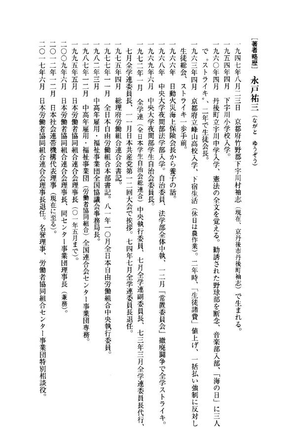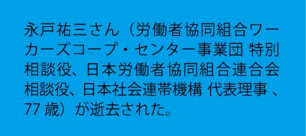永戸さんはぼくよりひとつ下だと思う。学生運動で活躍した後、全日自労で組合運動に参加。60年代、日本の高度経済成長と、そのための産業構造転換(炭坑閉鎖など)によって発生した失業の対策事業に携わる労働者を組織した。その後、労働者協同組合、ワーカーズコープの運動の中心にいて理論家としても活躍した。数年前の労働者協同組合法の法制化は永戸さん抜きには考えられない。運動の第一線から身を引いた後は、社会連帯機構に移り、沖縄問題などに執念を燃やした。
