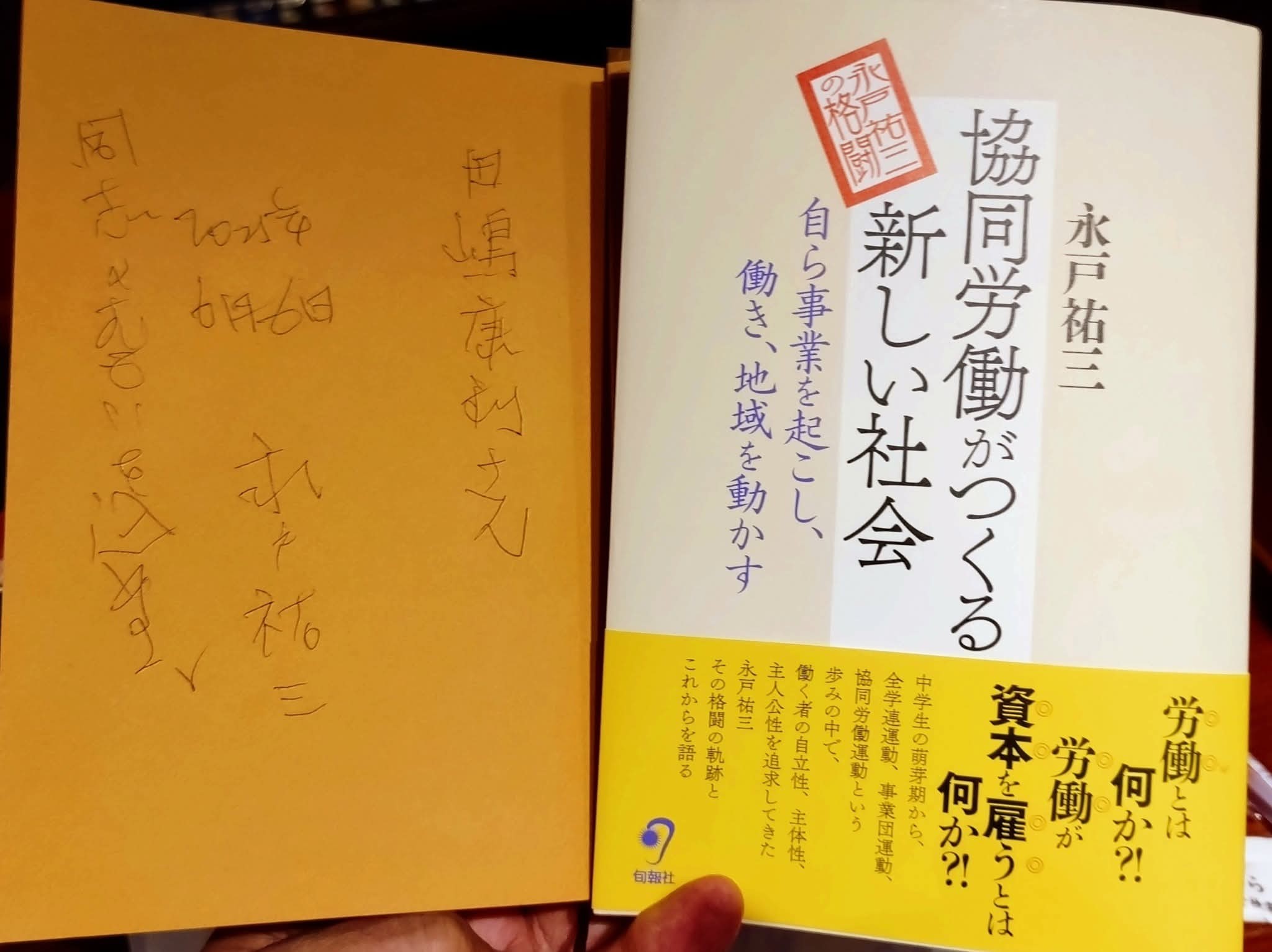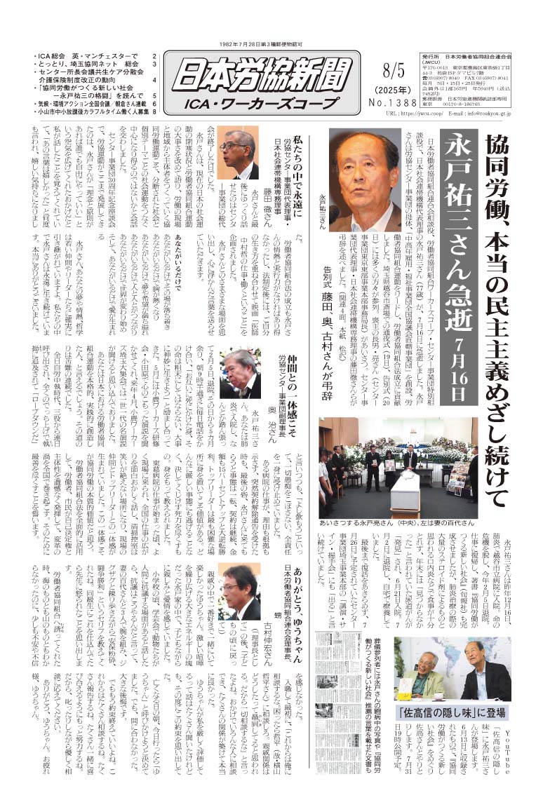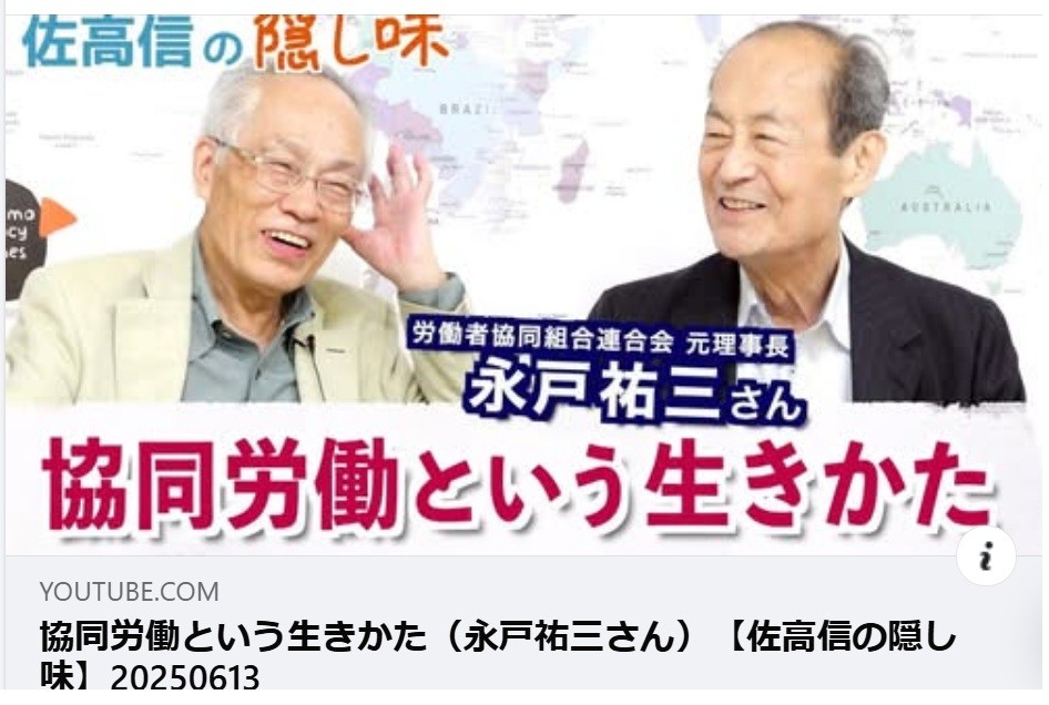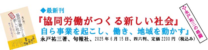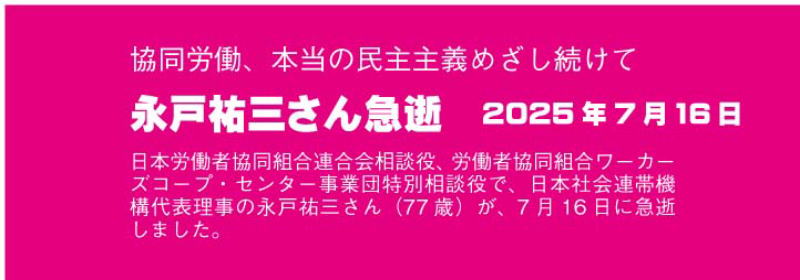 | 悲しい、寂しい、残念・無念・・・ あるメーリングで発信されている通り、わが時代のリーダーの一人だった永戸祐三さん(労働者協同組合ワーカーズコープ・センター事業団 特別相談役 日本労働者協同組合連合会 相談役、 日本社会連帯機構 代表理事 、77歳)が逝去された。 昨日、自宅にお別れしてきたが、まだまだ生きて「自立的で、主体的な社会的連帯運動と協同労働」を着実に広げる先陣を切り開いてほしかった。 6月11日に出版された「協同労働がつくる新しい社会―自ら事業を起こし、働き、地域を動かす」(永戸祐三著、旬報社、2025年6月、四六判上製。定価2200円(税込み))の「あとがき」を書くために「生還」し、本書を完成してお亡くなりになったようで、無念です。 ぜひ、彼の社会変革の精神、社会運動への連帯、協同労働の推進を、この出版物から学び、次の世代へのメッセージとしてほしい。 私も、「永戸祐三のページ」を編集して、最初のページを生前に見てもらっていたので、これは良かった。 尚、マイクロソフトの「msn」などの検索ページで、「永戸祐三」を入れて、その他の活動・実践ページを見てください。 |