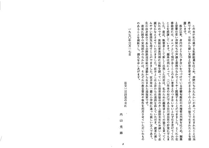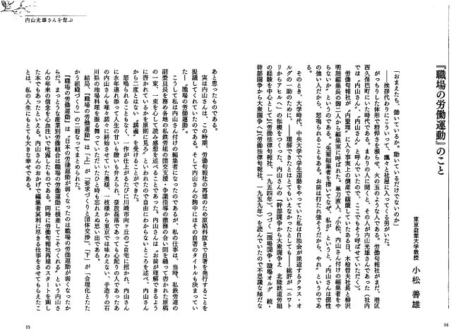 『追悼文集 内山光雄さんを偲ぶ』 『追悼文集 内山光雄さんを偲ぶ』(2012年11月19日、「内山光雄さんを偲ぶ」編集委員会、総評退職者会気付、03-3251-0311) ![]() 目次 内山さんのことども 兵藤 釗 生涯の教師としての内山光雄さん 高木郁朗 大地を踏みしめた天与のオルグナイザー 山本 博 『職場の労働運動』のこと 小松義雄 地域闘争に遺した偉大な足跡 粟森 喬 職場活動こそ人間がいる 渕上貞雄 内山光雄さんのご逝去を悼んで 越田智宏 追悼の辞 渡邊國衛 道南バス会社更正法下の闘いと組合員読本づくり 大谷浩 職場総点検運動 井田隆重 面白うて やがて身に泌む 内山節 高橋征夫 内山光雄さん追悼 高橋 均 自主管理社会の原典を学ぶ 佐々木啓之 観光労連育ての親、そして上司として 北岡孝義 “職場”と“人間”に徹した指導者 瀧井葉二 感謝の言葉 在り日を偲んで 内山一枝 |